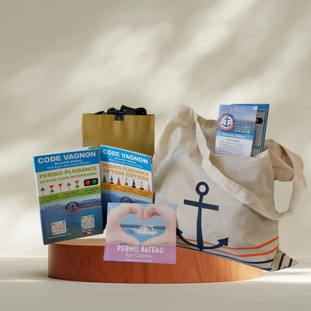 Nous avons plusieurs formules, le permis de base est le permis côtier ou le permis fluvial, offrir les deux c’est encore mieux, 50% des connaissances sont identiques aux deux permis. Vous avez la possibilité de choisir le coffret ou le bon cadeau envoyé par mail.